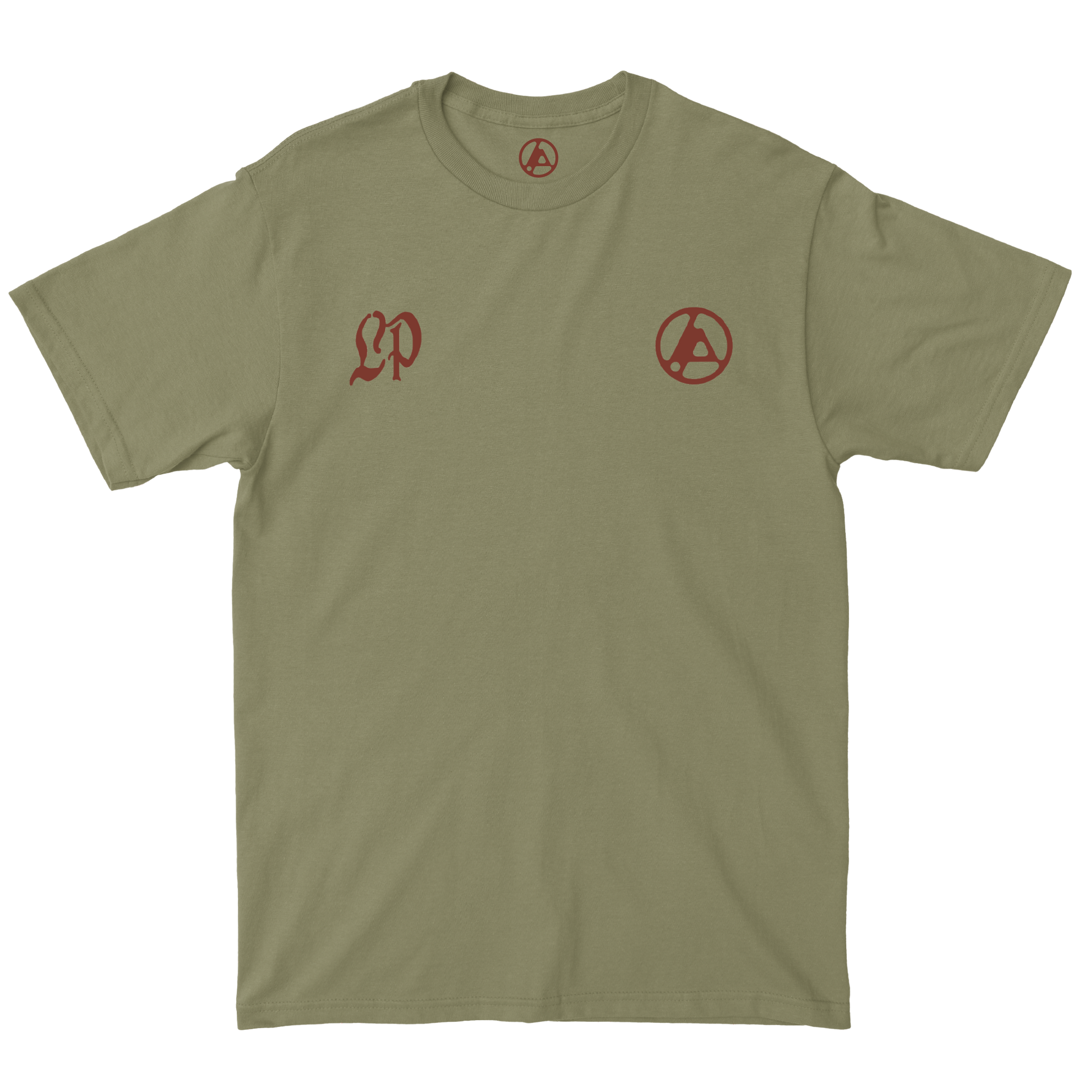 Unisex light olive tee featuring an "LP" on front right chest, morph icon on front left chest, and Linkin Park repeated graphic on back.