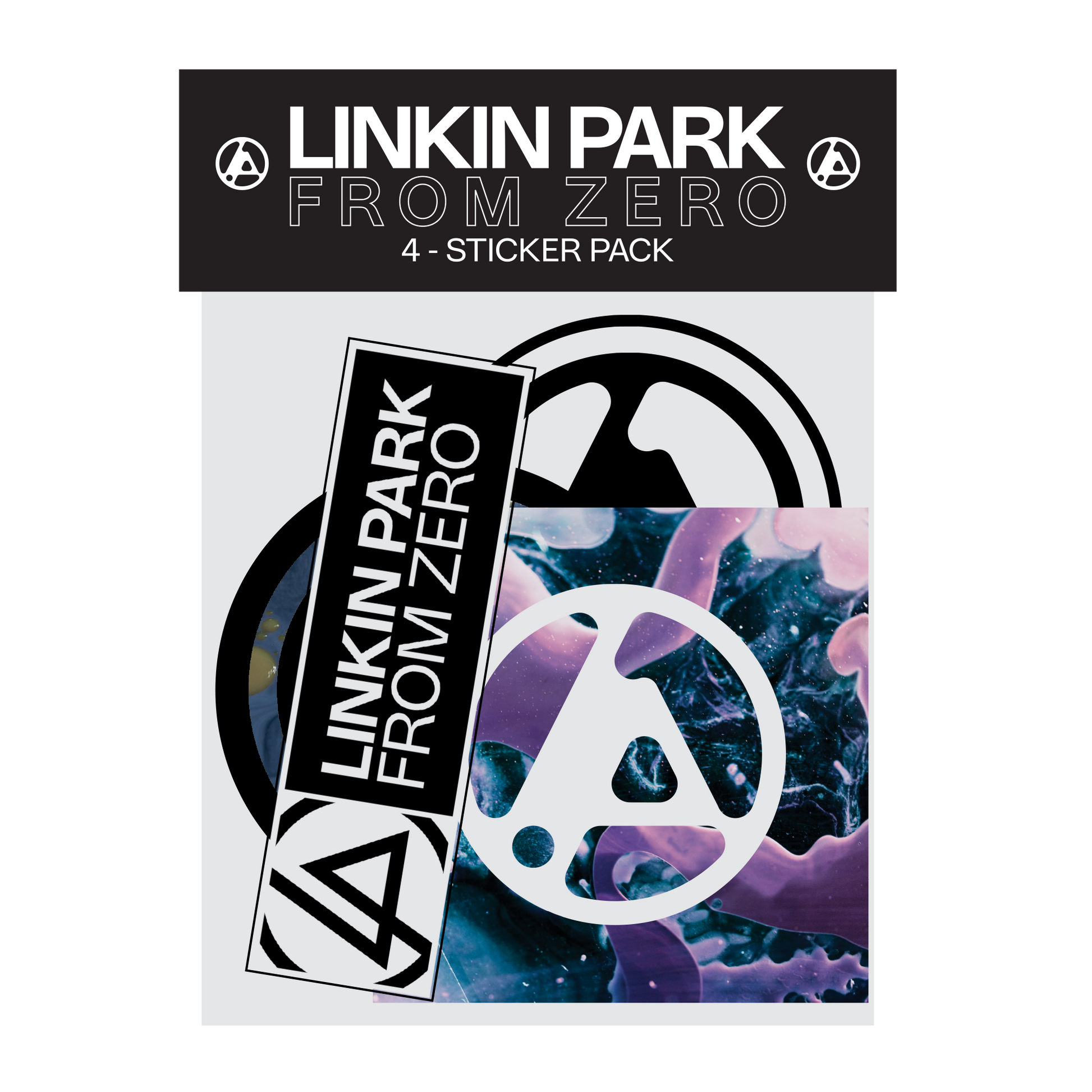 Sticker set includes four high quality stickers: Black and white morph icon (3.5" x 3.5"); Circle liquid morph icon (3.5" x 3.5"); Square liquid morph icon (3.5" x 3.5"); and LINKIN PARK // FROM ZERO rectangle (4" x 1.2").