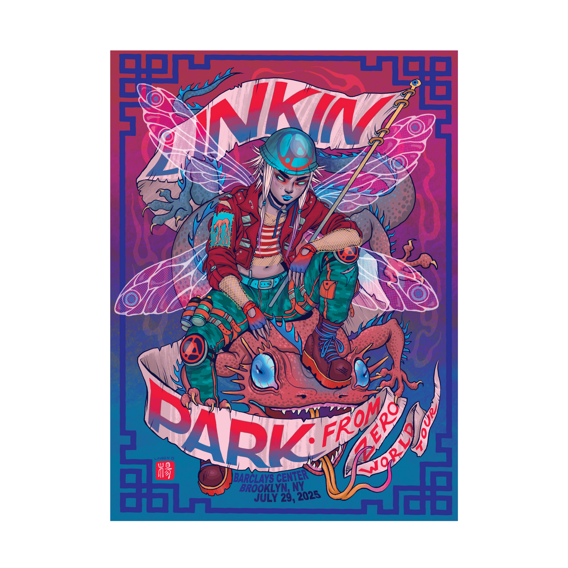 Linkin Park has commissioned artist Lauren YS to create artwork for a limited-edition poster for the 2025 From Zero World Tour stop in Brooklyn. Each hand-numbered print is limited to 200 copies and is printed on 18" x 24" heavy cold press cotton rag 300gsm paper with a deckle edge.