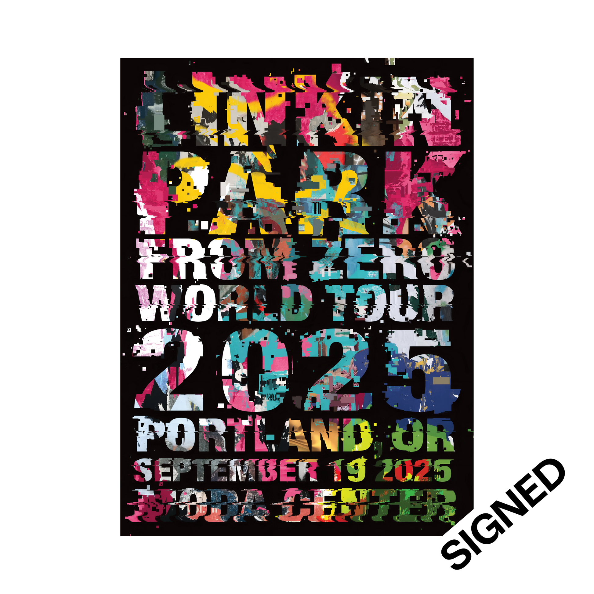 Linkin Park has commissioned artist ASKEW ONE to create artwork for a limited-edition poster for the 2025 From Zero World Tour stop in Portland. Signed by the band, each hand-numbered print is limited to 10 copies and is printed on 18" x 24" heavy cold press cotton rag 300gsm paper with a deckle edge.