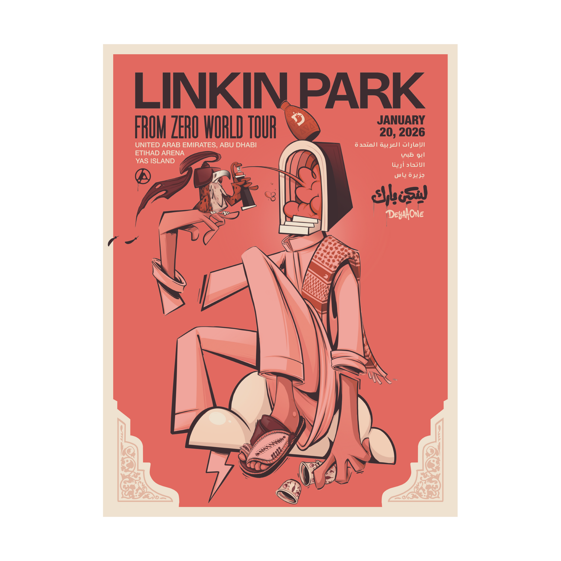 Linkin Park has commissioned artist Deyaa Rambo to create artwork for a limited-edition poster for the 2026 From Zero World Tour stop in Abu Dhabi. Each hand-numbered print is limited to 100 copies and is printed on 18" x 24" heavy cold press cotton rag 300gsm paper with a deckle edge.