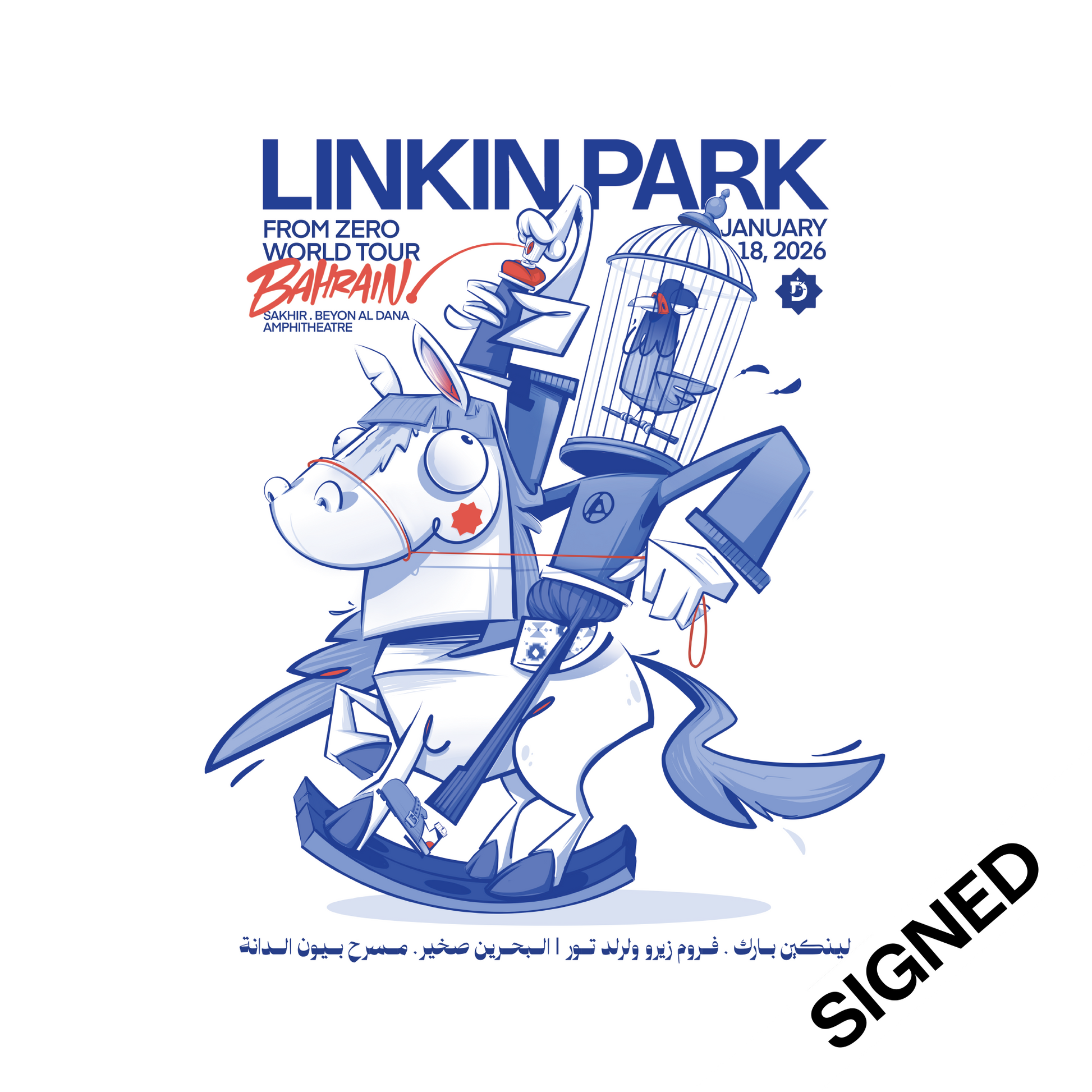 Linkin Park has commissioned artist Deyaa Rambo to create artwork for a limited-edition poster for the 2026 From Zero World Tour stop in Sakhir. Signed by the band, each hand-numbered print is limited to 10 copies and is printed on 18" x 24" heavy cold press cotton rag 300gsm paper with a deckle edge.