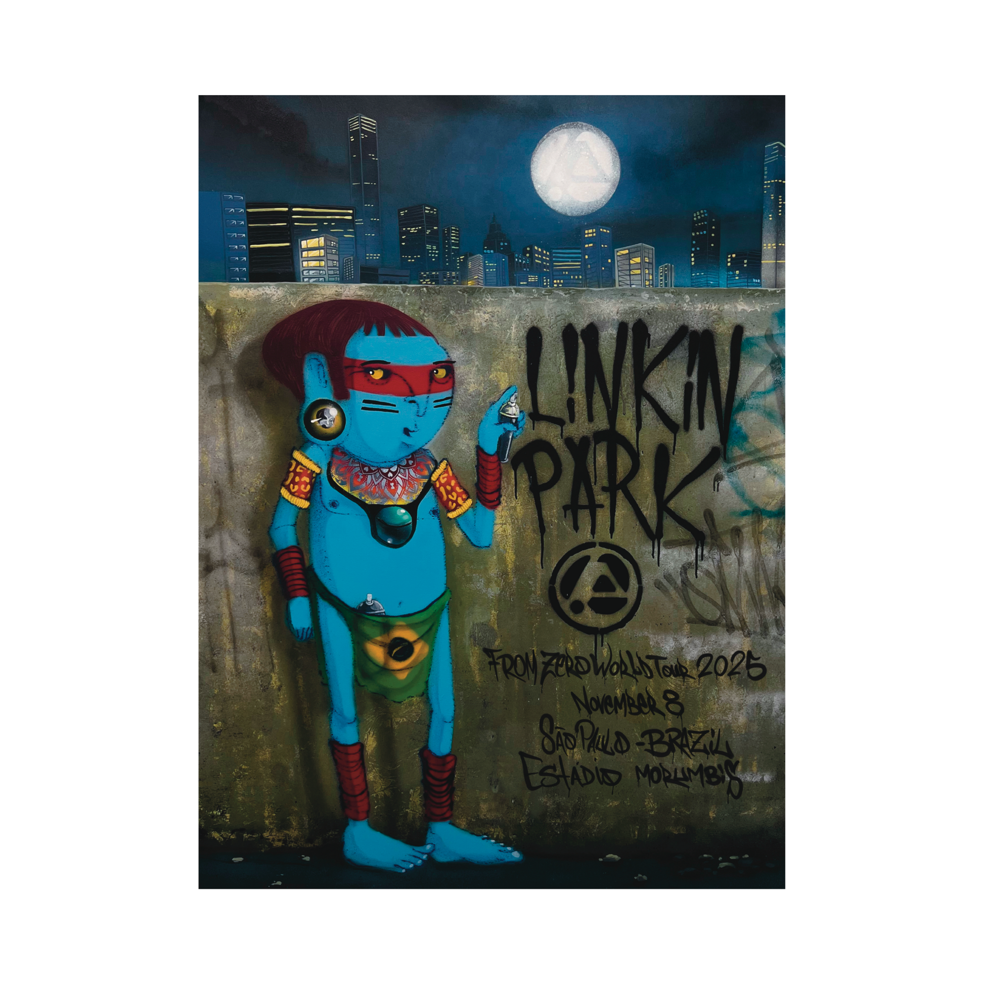 Linkin Park has commissioned artist Cranio to create artwork for a limited-edition poster for the 2025 From Zero World Tour stop in Sao Paulo. Each hand-numbered print is limited to 100 copies and is printed on 18" x 24" heavy cold press cotton rag 300gsm paper with a deckle edge.