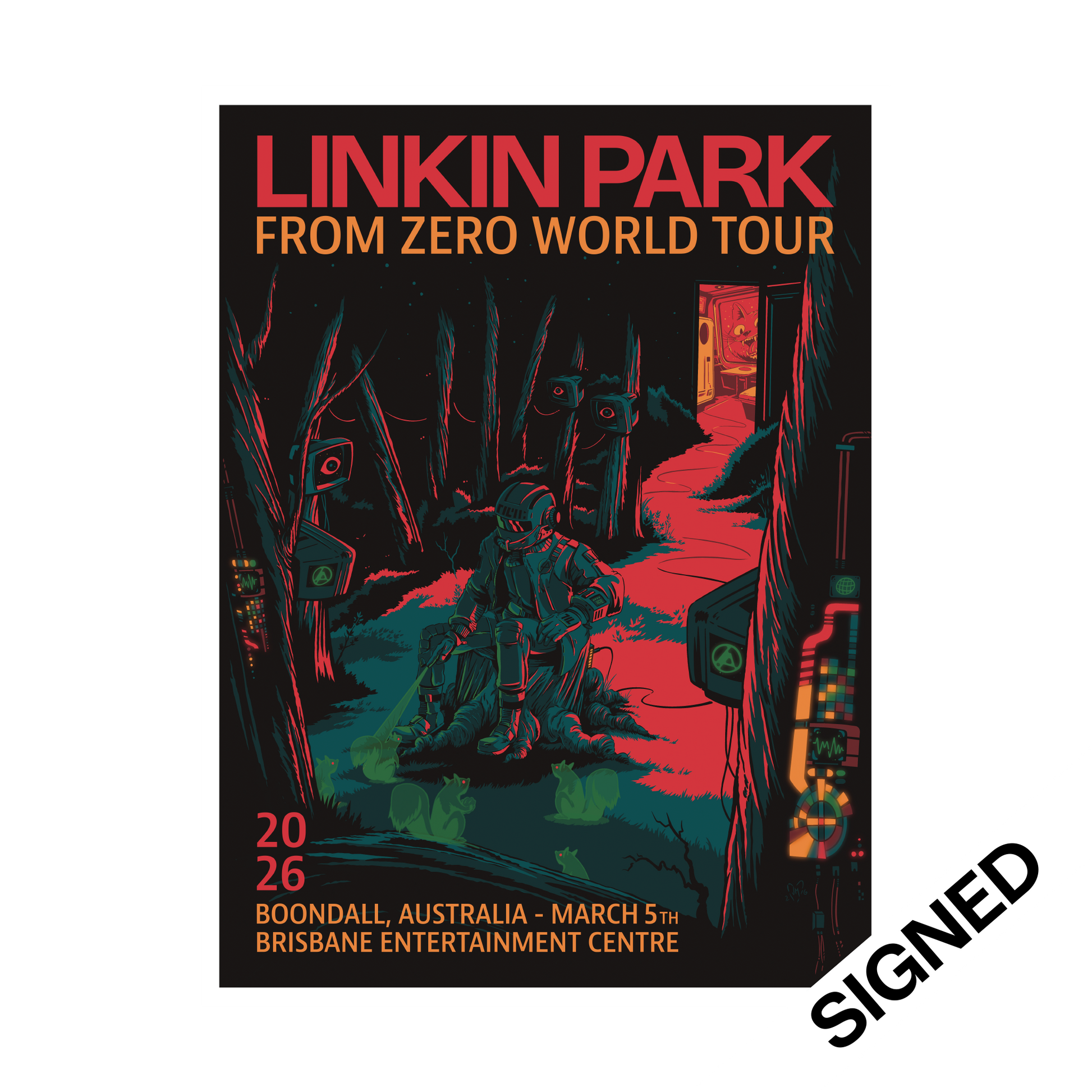 Linkin Park has commissioned artist Jeff McMillan to create artwork for a limited-edition poster for the 2026 From Zero World Tour stop in Boondall. Signed by the band, each hand-numbered print is limited to 10 copies and is printed on 18" x 24" heavy cold press cotton rag 300gsm paper with a deckle edge.