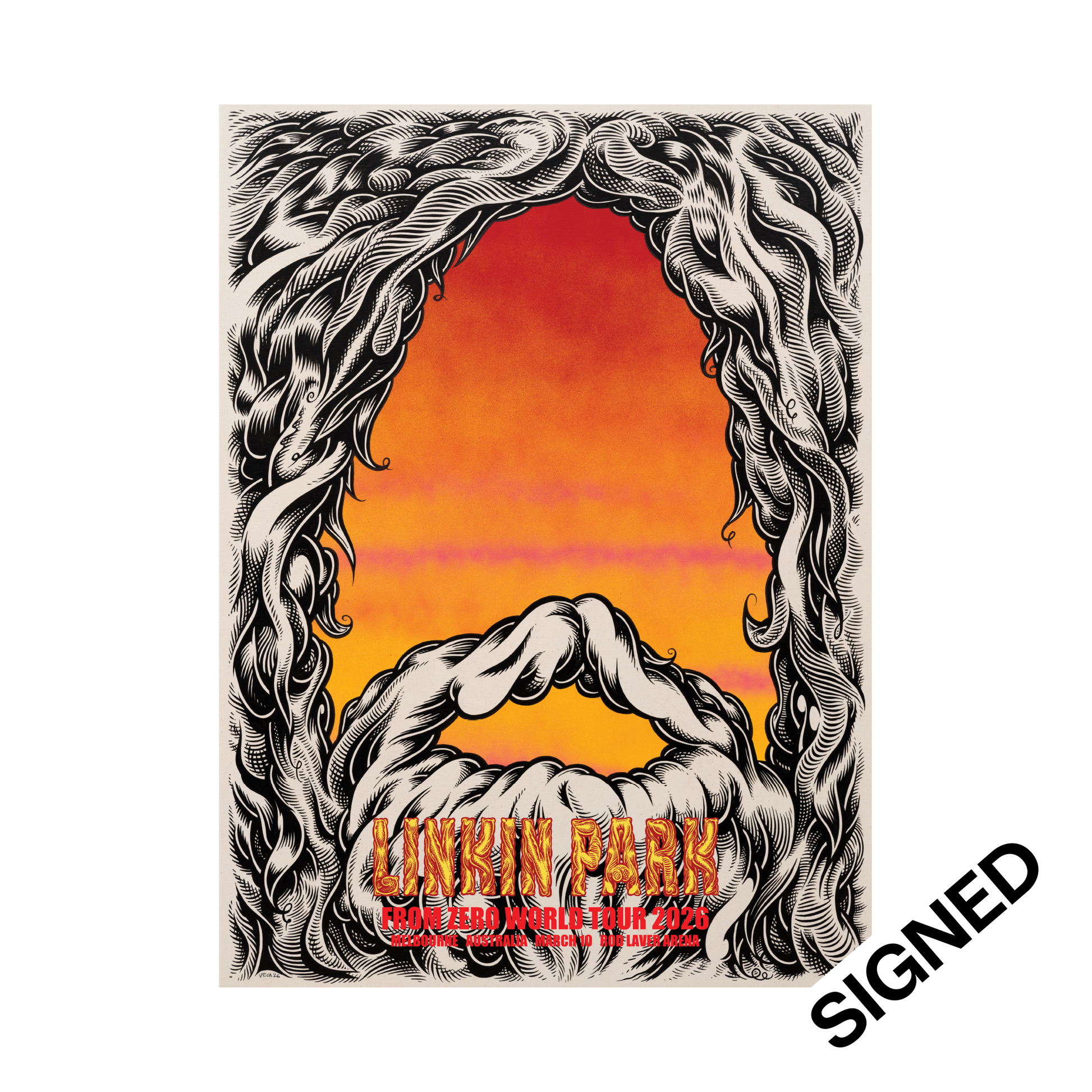 Linkin Park has commissioned artist Mark Dean Veca to create artwork for a limited-edition poster for the 2026 From Zero World Tour stop in Melbourne. Signed by the band, each hand-numbered print is limited to 10 copies and is printed on 18" x 24" heavy cold press cotton rag 300gsm paper with a deckle edge.