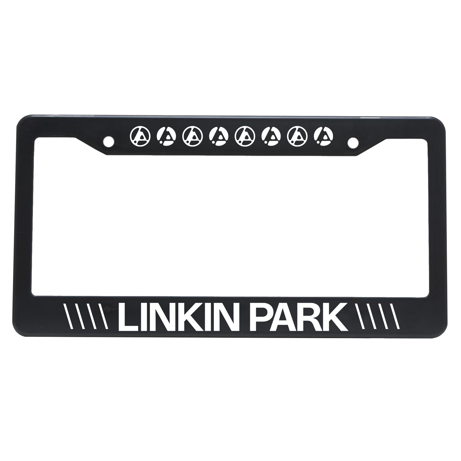 Black high-impact polystyrene license plate frame featuring LP morph logos repeated along the top and "Linkin Park" on bottom. All text is printed with durable, weatherproof inks. Frame size: 12.25" x 6.25".