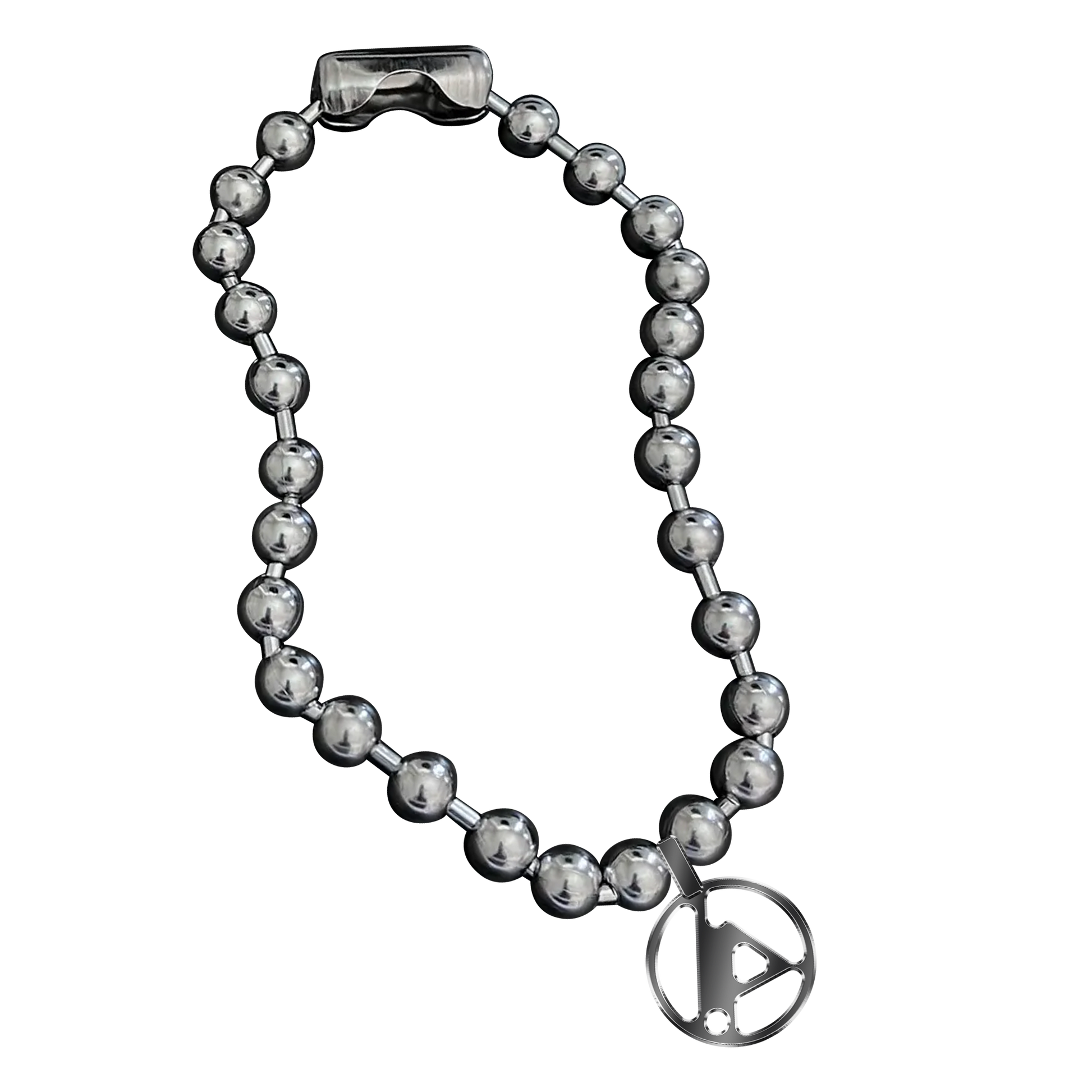 Metal ball chain necklace with LP morph icon pendant. 8mm gauge 18" chain. 1" diameter pendant.