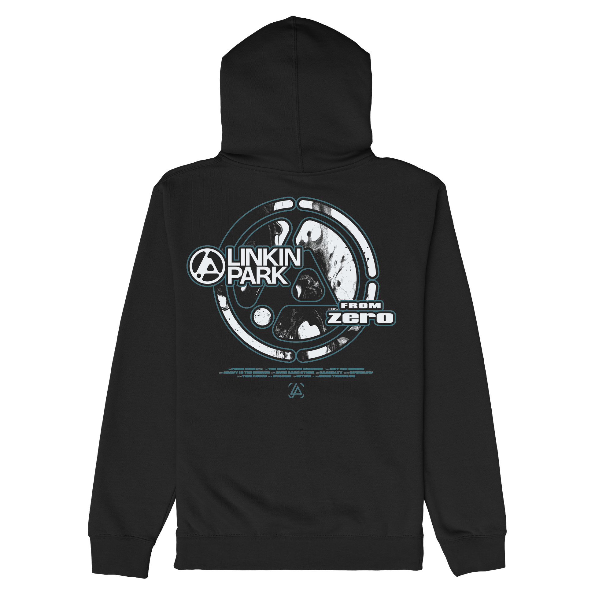 Unisex black zip-up hoodie featuring "Linkin Park" morph logo on front left chest and large swirl logo graphic on back.