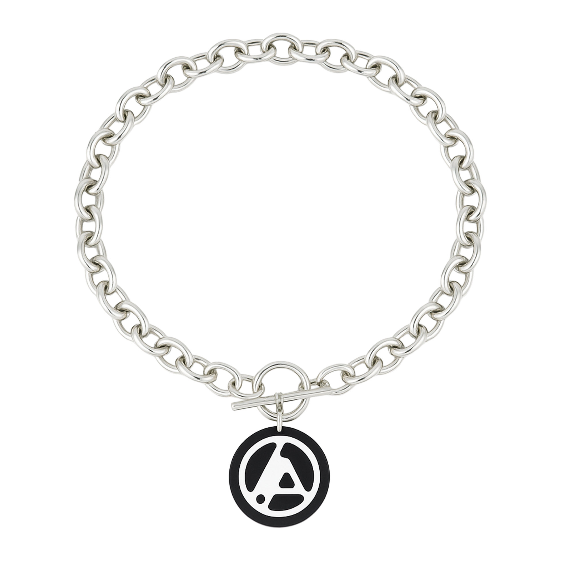 Silver colored toggle necklace featuring an LP morph icon charm. Titanium steel chain. 45 cm long. 1" diameter charm.