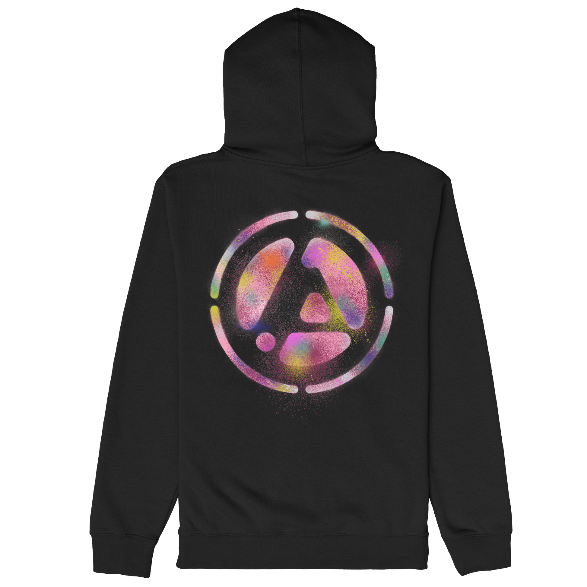 Unisex black zip-up hoodie featuring an original spray paint logo design by Joe Hahn small on front left chest and large on back.